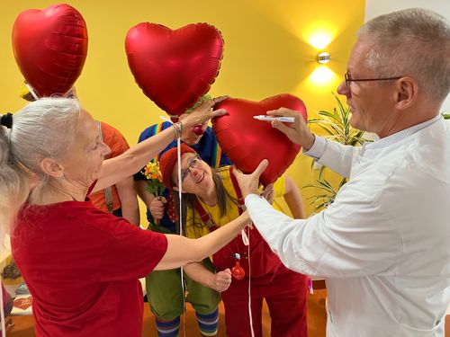 Mit ihren roten Nasen kommen sie jeden Donnerstag durch die Türen der Krankenzimmer. Mit Luftballons, Zauberstäben und Trillerpfeifen versuchen sie dann die Kinder aus ihrem trüben Klinikalltag zu entführen. „Sie spenden Freude“, sagte Professor Beerbaum und setzte sich zum Gruppenfoto dabei selbst eine rote Nase auf. Die Clowns im Krankenhaus hätten sich mit den Jahren bewährt, sie seien nur etwas älter geworden. Beerbaum: „Man kann aber sagen: Je älter, desto lustiger!“ Die erkrankten Kinder mal auf andere Gedanken zu bringen, trage eindeutig zur Genesung bei.